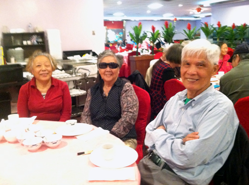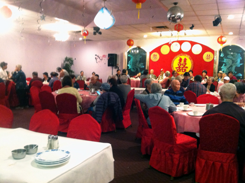 已有不少人了,到了飯店大家按照號碼找自己的坐位。一共有10桌。那天我和鄭媺很榮幸,我們的座位在平時表演節目的台上,那里擺了二桌,我和鄭媺的號正好都在台上的桌子。那天寶龍佈置得很好看,一進去就感到溫馨又喜慶,還有多了不少亮晶晶的燈,氣氛很好。