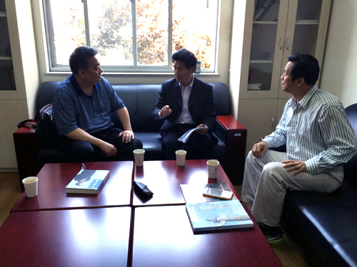 圖3:上海交通大學人文學院院長、《文化中華》總編輯楊慶存(中)、主編許建平(右)與冰凌商討進一步辦好《文化中華》雜誌。(石峰雁 攝)